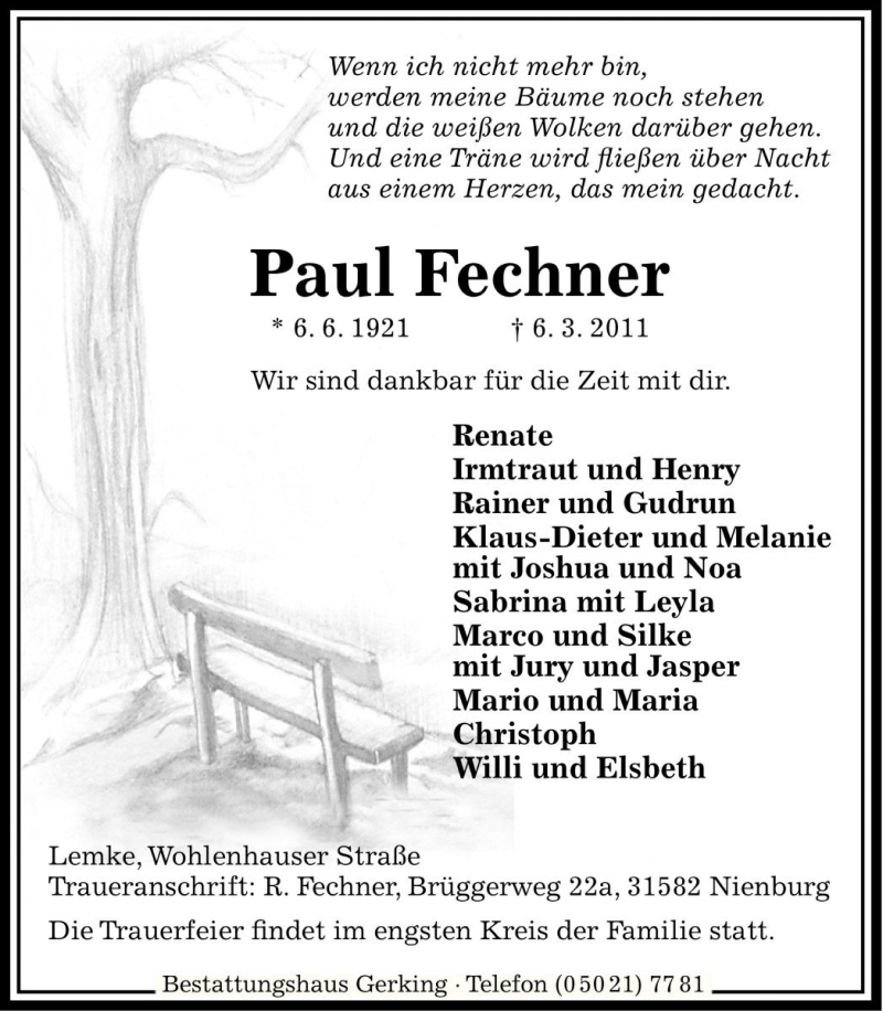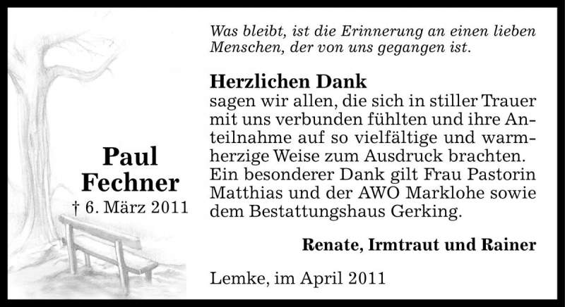 Hier finden Sie alle Traueranzeigen aus der Zeitung, die bisher für Paul Fechner erschienen sind. Weitere Traueranzeigen, die in der Zeitung erscheinen, werden hier ebenfalls aufgelistet
