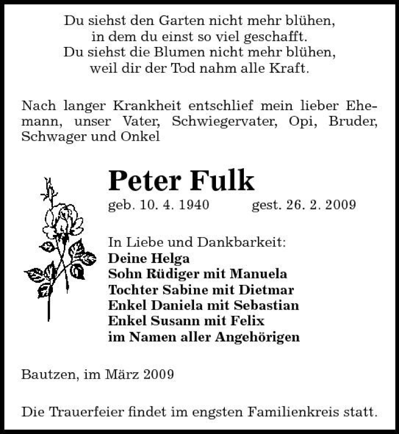 Hier finden Sie alle Traueranzeigen aus der Zeitung, die bisher für Peter Fulk erschienen sind. Weitere Traueranzeigen, die in der Zeitung erscheinen, werden hier ebenfalls aufgelistet