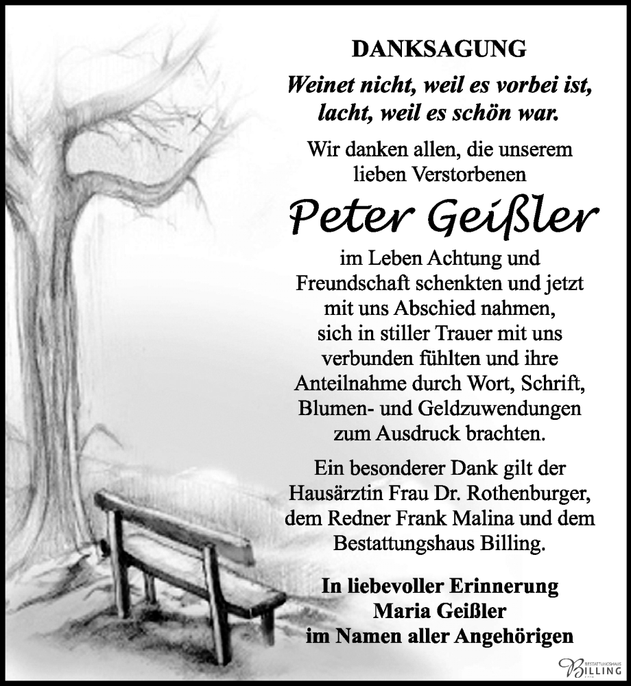 Hier finden Sie alle Traueranzeigen aus der Zeitung, die bisher für Peter Geißler erschienen sind. Weitere Traueranzeigen, die in der Zeitung erscheinen, werden hier ebenfalls aufgelistet