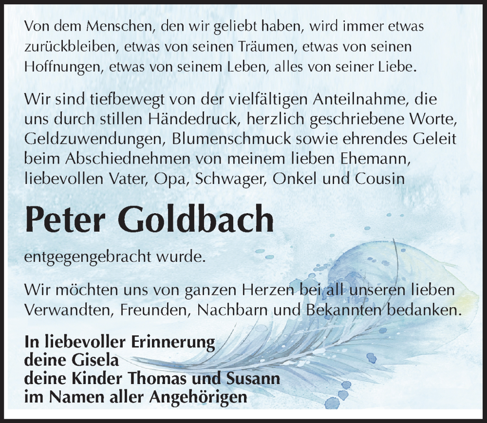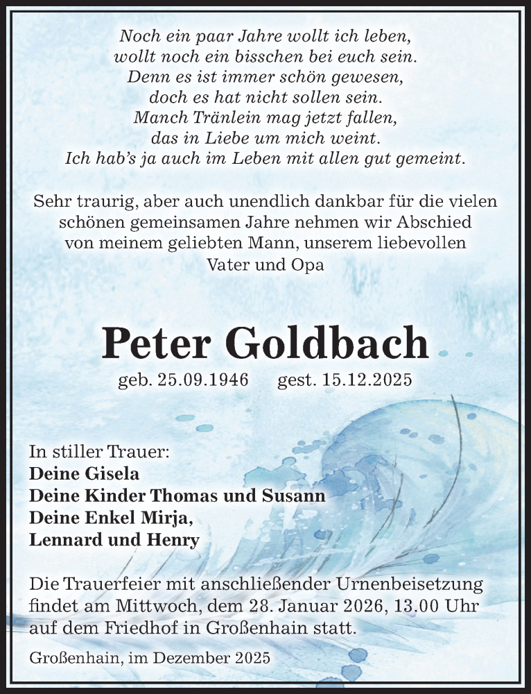 Hier finden Sie alle Traueranzeigen aus der Zeitung, die bisher für Peter Goldbach erschienen sind. Weitere Traueranzeigen, die in der Zeitung erscheinen, werden hier ebenfalls aufgelistet