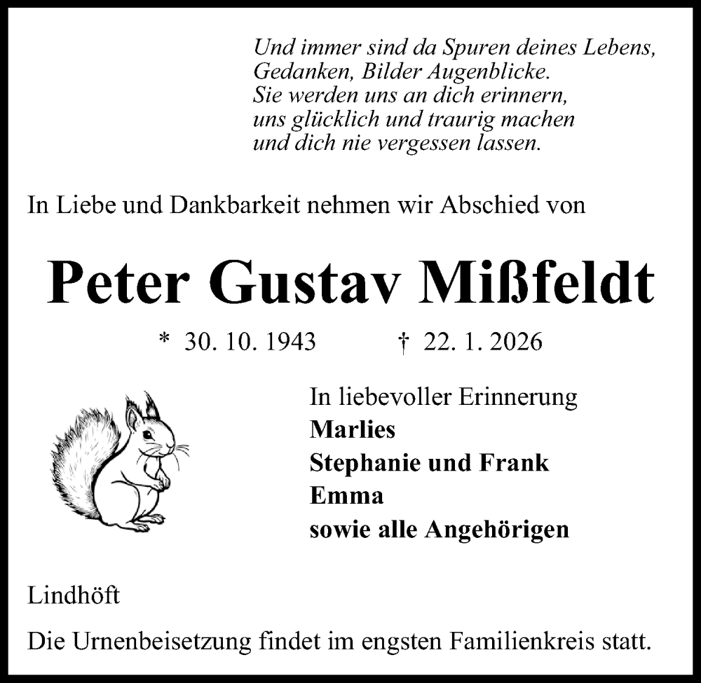 Hier finden Sie alle Traueranzeigen aus der Zeitung, die bisher für Peter Gustav Mißfeldt erschienen sind. Weitere Traueranzeigen, die in der Zeitung erscheinen, werden hier ebenfalls aufgelistet