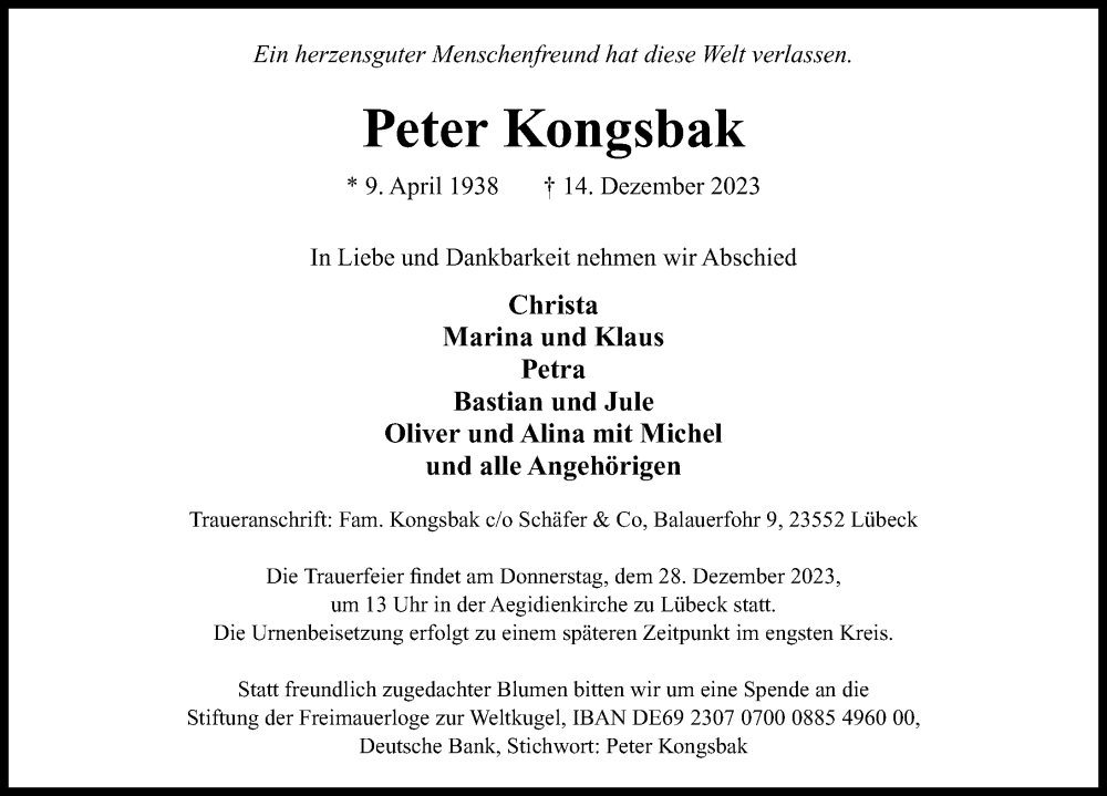Hier finden Sie alle Traueranzeigen aus der Zeitung, die bisher für Peter Kongsbak erschienen sind. Weitere Traueranzeigen, die in der Zeitung erscheinen, werden hier ebenfalls aufgelistet