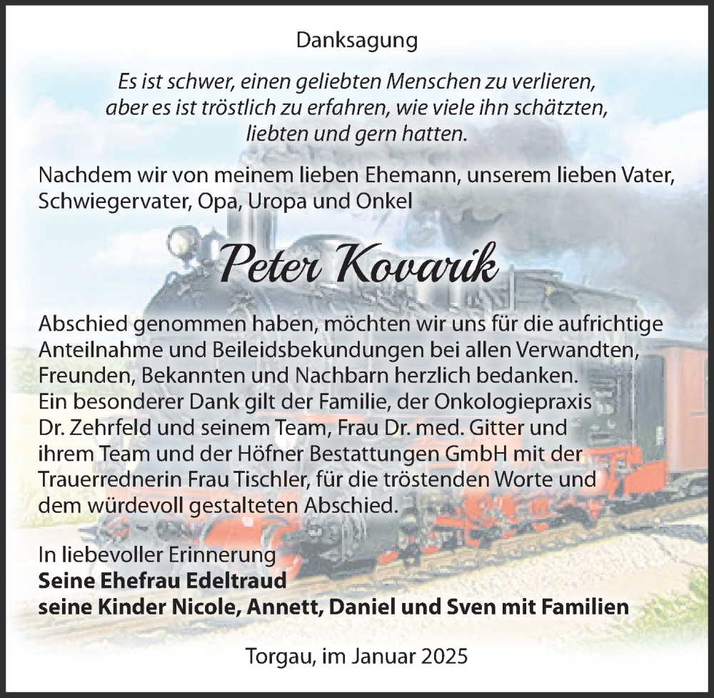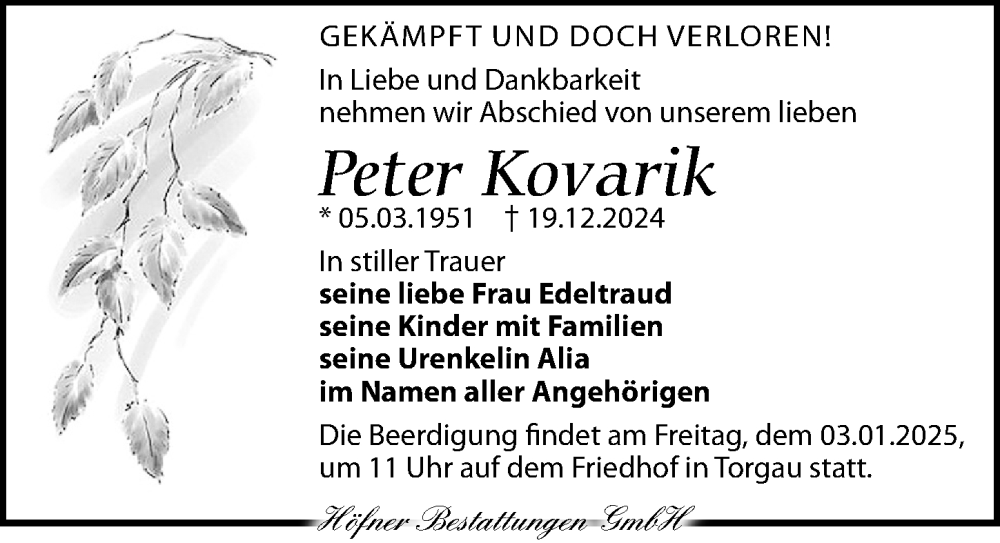 Hier finden Sie alle Traueranzeigen aus der Zeitung, die bisher für Peter Kovarik erschienen sind. Weitere Traueranzeigen, die in der Zeitung erscheinen, werden hier ebenfalls aufgelistet