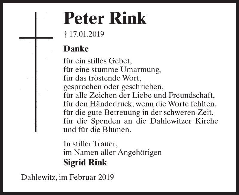 Hier finden Sie alle Traueranzeigen aus der Zeitung, die bisher für Peter Rink erschienen sind. Weitere Traueranzeigen, die in der Zeitung erscheinen, werden hier ebenfalls aufgelistet