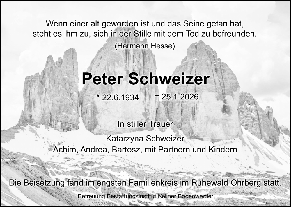 Hier finden Sie alle Traueranzeigen aus der Zeitung, die bisher für Peter Schweizer erschienen sind. Weitere Traueranzeigen, die in der Zeitung erscheinen, werden hier ebenfalls aufgelistet