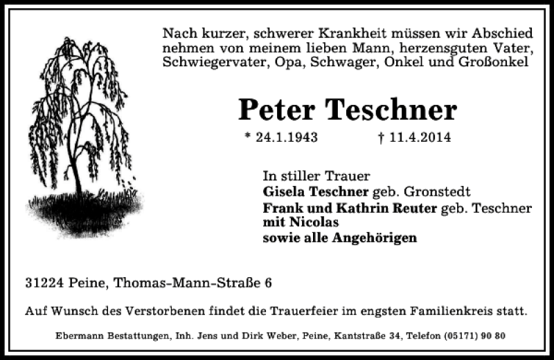 Hier finden Sie alle Traueranzeigen aus der Zeitung, die bisher für Peter Teschner erschienen sind. Weitere Traueranzeigen, die in der Zeitung erscheinen, werden hier ebenfalls aufgelistet