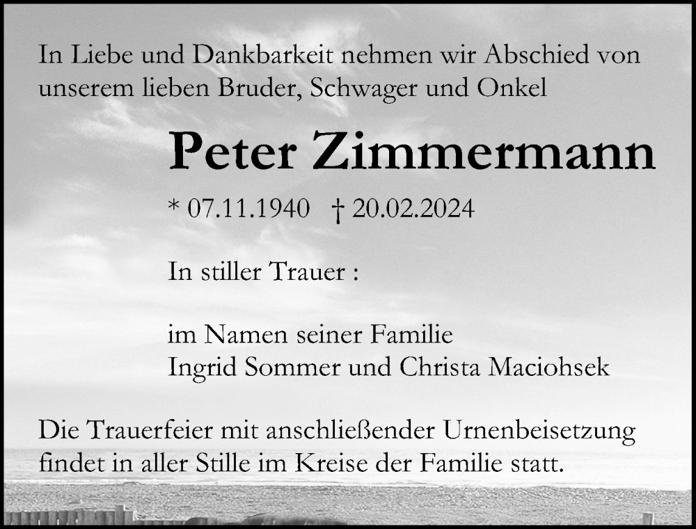 Hier finden Sie alle Traueranzeigen aus der Zeitung, die bisher für Peter Zimmermann erschienen sind. Weitere Traueranzeigen, die in der Zeitung erscheinen, werden hier ebenfalls aufgelistet
