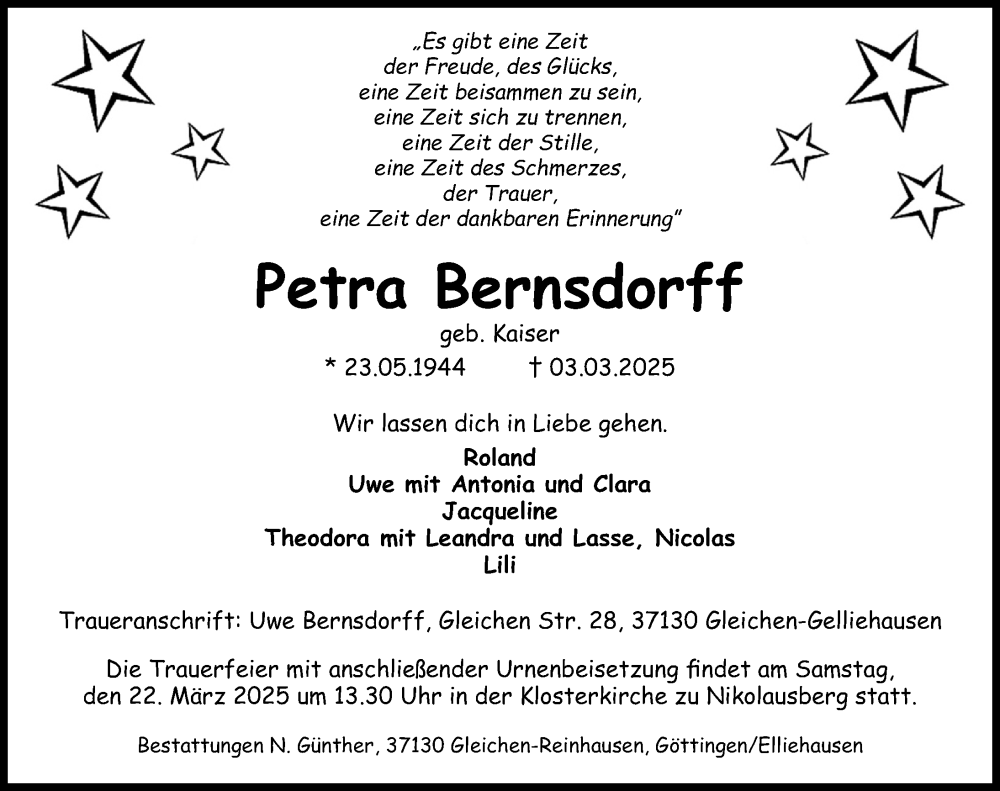 Hier finden Sie alle Traueranzeigen aus der Zeitung, die bisher für Petra Bernsdorff erschienen sind. Weitere Traueranzeigen, die in der Zeitung erscheinen, werden hier ebenfalls aufgelistet