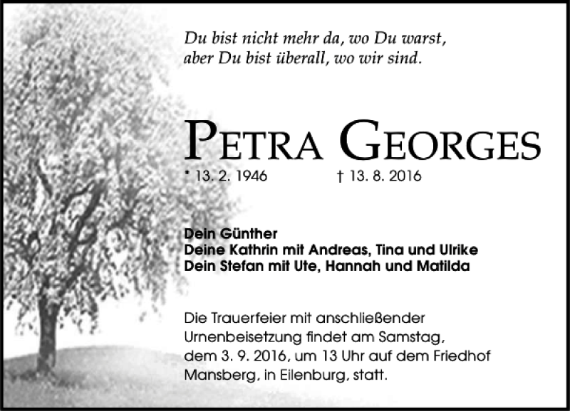 Hier finden Sie alle Traueranzeigen aus der Zeitung, die bisher für Petra Georges erschienen sind. Weitere Traueranzeigen, die in der Zeitung erscheinen, werden hier ebenfalls aufgelistet