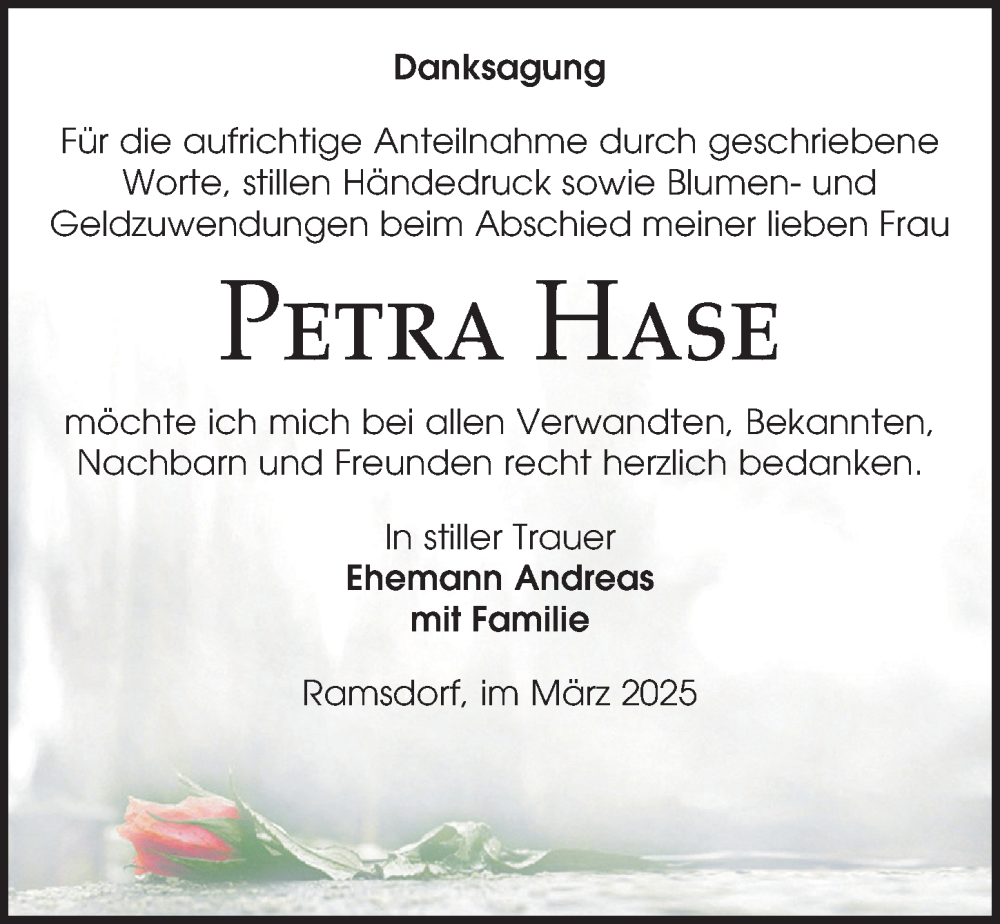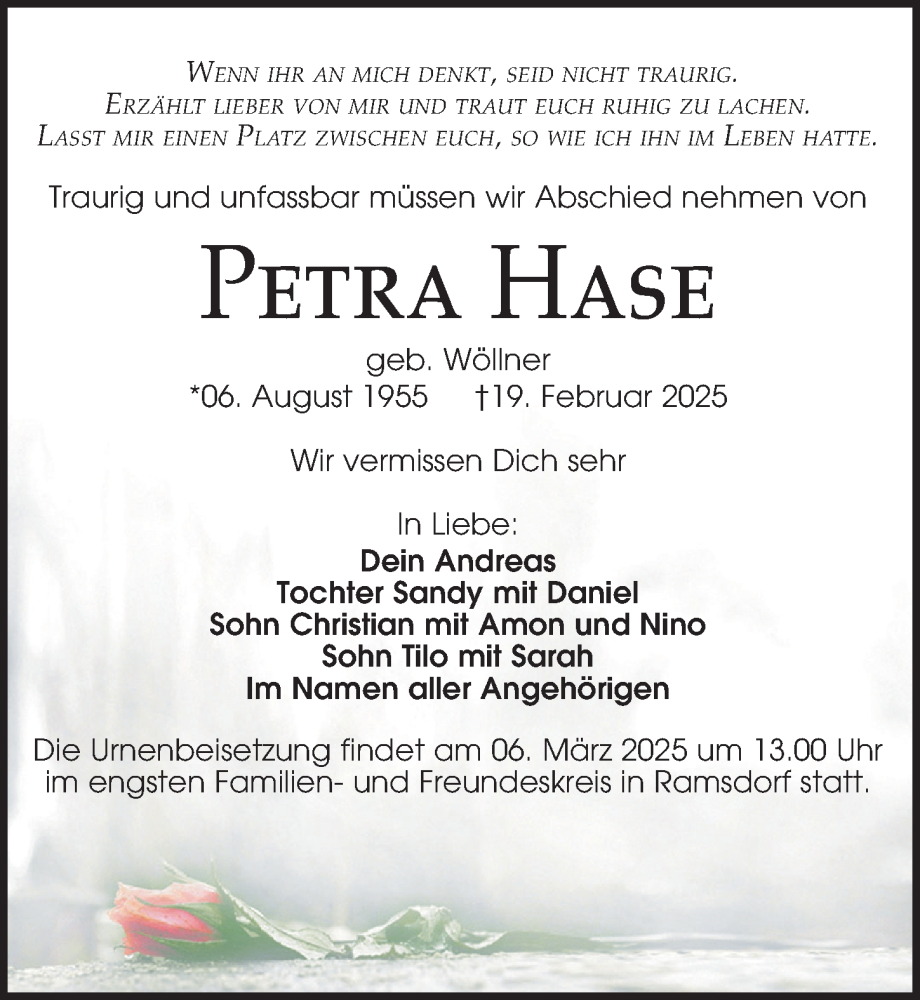 Hier finden Sie alle Traueranzeigen aus der Zeitung, die bisher für Petra Hase erschienen sind. Weitere Traueranzeigen, die in der Zeitung erscheinen, werden hier ebenfalls aufgelistet