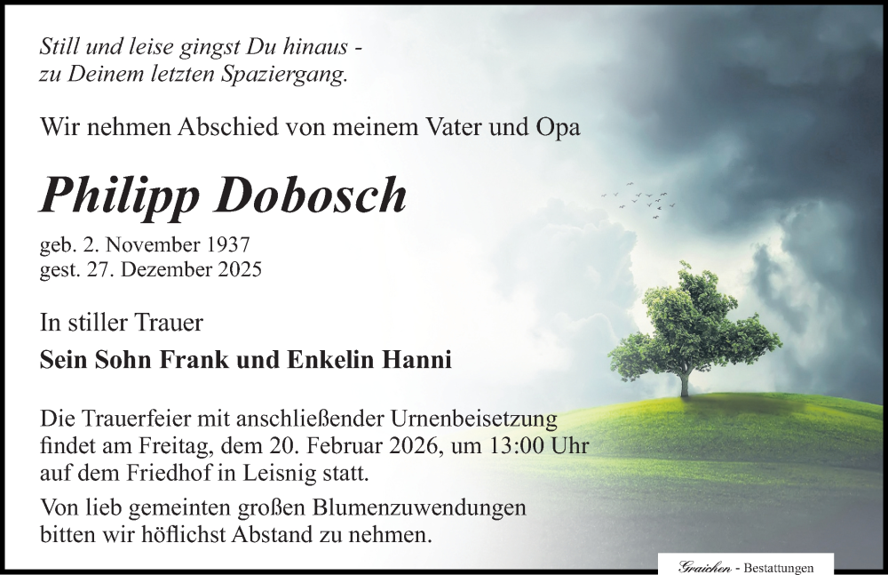 Hier finden Sie alle Traueranzeigen aus der Zeitung, die bisher für Philipp Dobosch erschienen sind. Weitere Traueranzeigen, die in der Zeitung erscheinen, werden hier ebenfalls aufgelistet