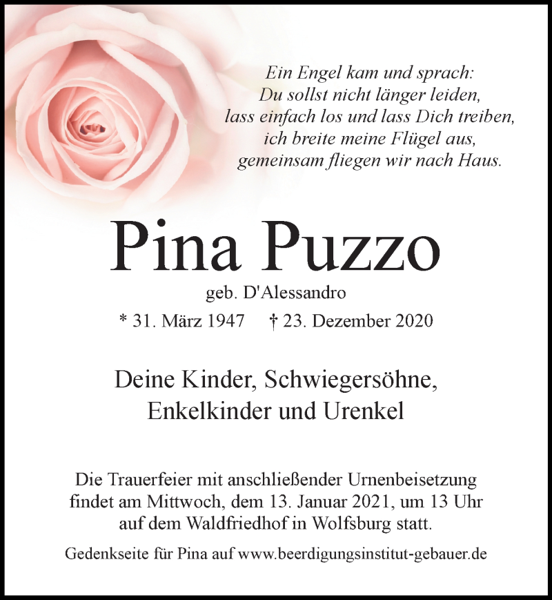 Hier finden Sie alle Traueranzeigen aus der Zeitung, die bisher für Pina Puzzo erschienen sind. Weitere Traueranzeigen, die in der Zeitung erscheinen, werden hier ebenfalls aufgelistet