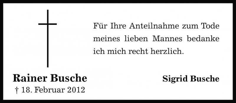 Hier finden Sie alle Traueranzeigen aus der Zeitung, die bisher für Rainer Busche erschienen sind. Weitere Traueranzeigen, die in der Zeitung erscheinen, werden hier ebenfalls aufgelistet