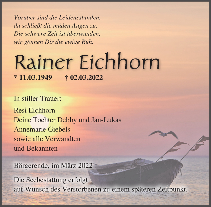 Hier finden Sie alle Traueranzeigen aus der Zeitung, die bisher für Rainer Eichhorn erschienen sind. Weitere Traueranzeigen, die in der Zeitung erscheinen, werden hier ebenfalls aufgelistet
