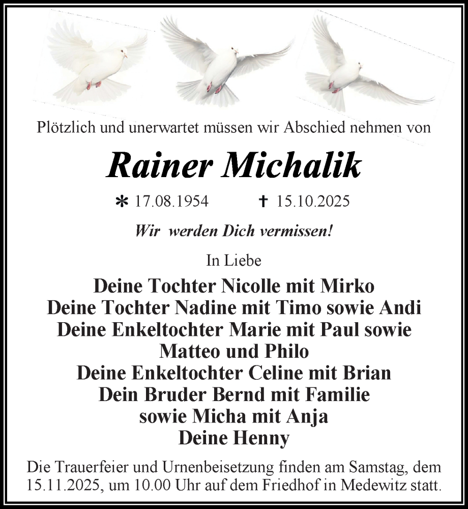 Hier finden Sie alle Traueranzeigen aus der Zeitung, die bisher für Rainer Michalik erschienen sind. Weitere Traueranzeigen, die in der Zeitung erscheinen, werden hier ebenfalls aufgelistet