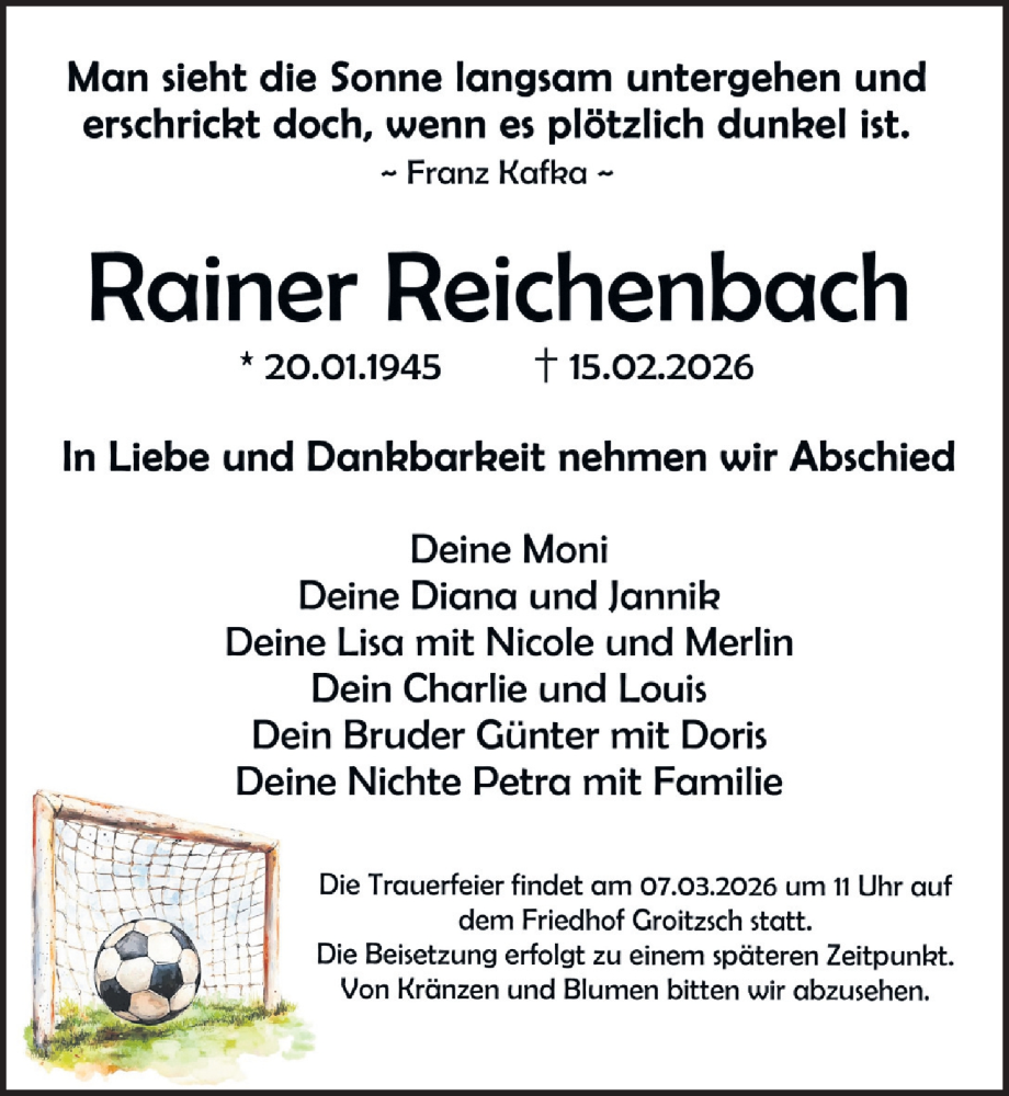 Hier finden Sie alle Traueranzeigen aus der Zeitung, die bisher für Rainer Reichenbach erschienen sind. Weitere Traueranzeigen, die in der Zeitung erscheinen, werden hier ebenfalls aufgelistet