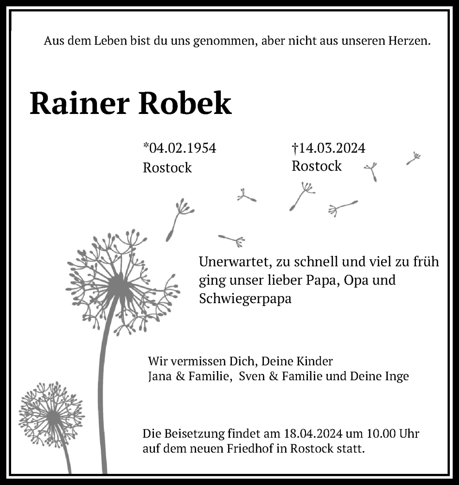 Hier finden Sie alle Traueranzeigen aus der Zeitung, die bisher für Rainer Robek erschienen sind. Weitere Traueranzeigen, die in der Zeitung erscheinen, werden hier ebenfalls aufgelistet