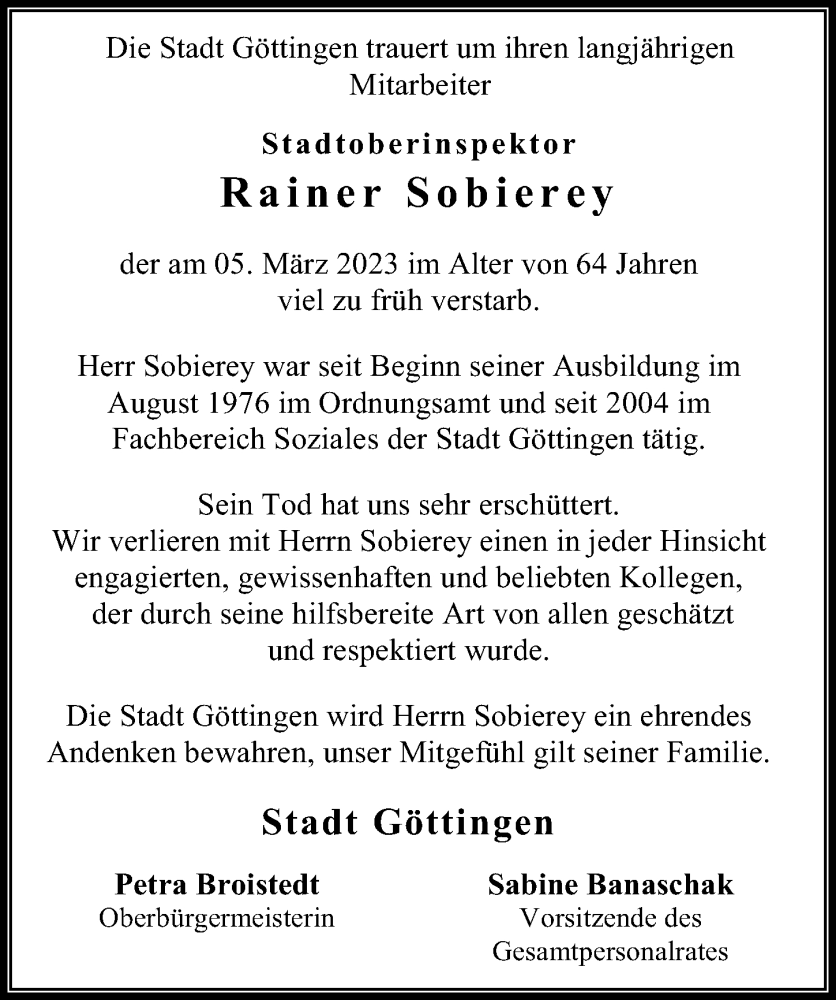 Hier finden Sie alle Traueranzeigen aus der Zeitung, die bisher für Rainer Sobierey erschienen sind. Weitere Traueranzeigen, die in der Zeitung erscheinen, werden hier ebenfalls aufgelistet