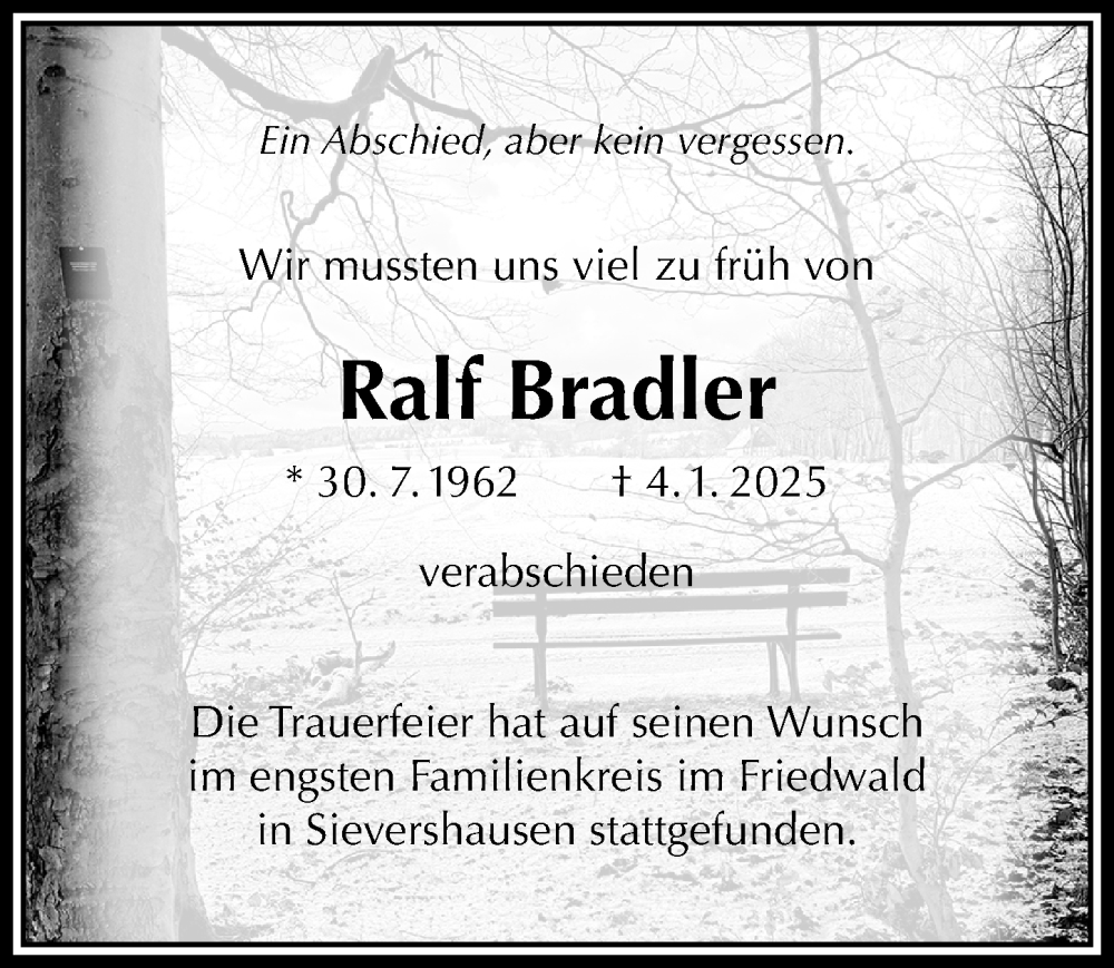 Hier finden Sie alle Traueranzeigen aus der Zeitung, die bisher für Ralf Bradler erschienen sind. Weitere Traueranzeigen, die in der Zeitung erscheinen, werden hier ebenfalls aufgelistet