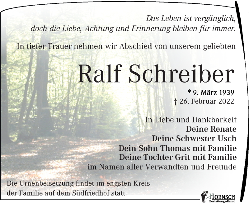 Hier finden Sie alle Traueranzeigen aus der Zeitung, die bisher für Ralf Schreiber erschienen sind. Weitere Traueranzeigen, die in der Zeitung erscheinen, werden hier ebenfalls aufgelistet