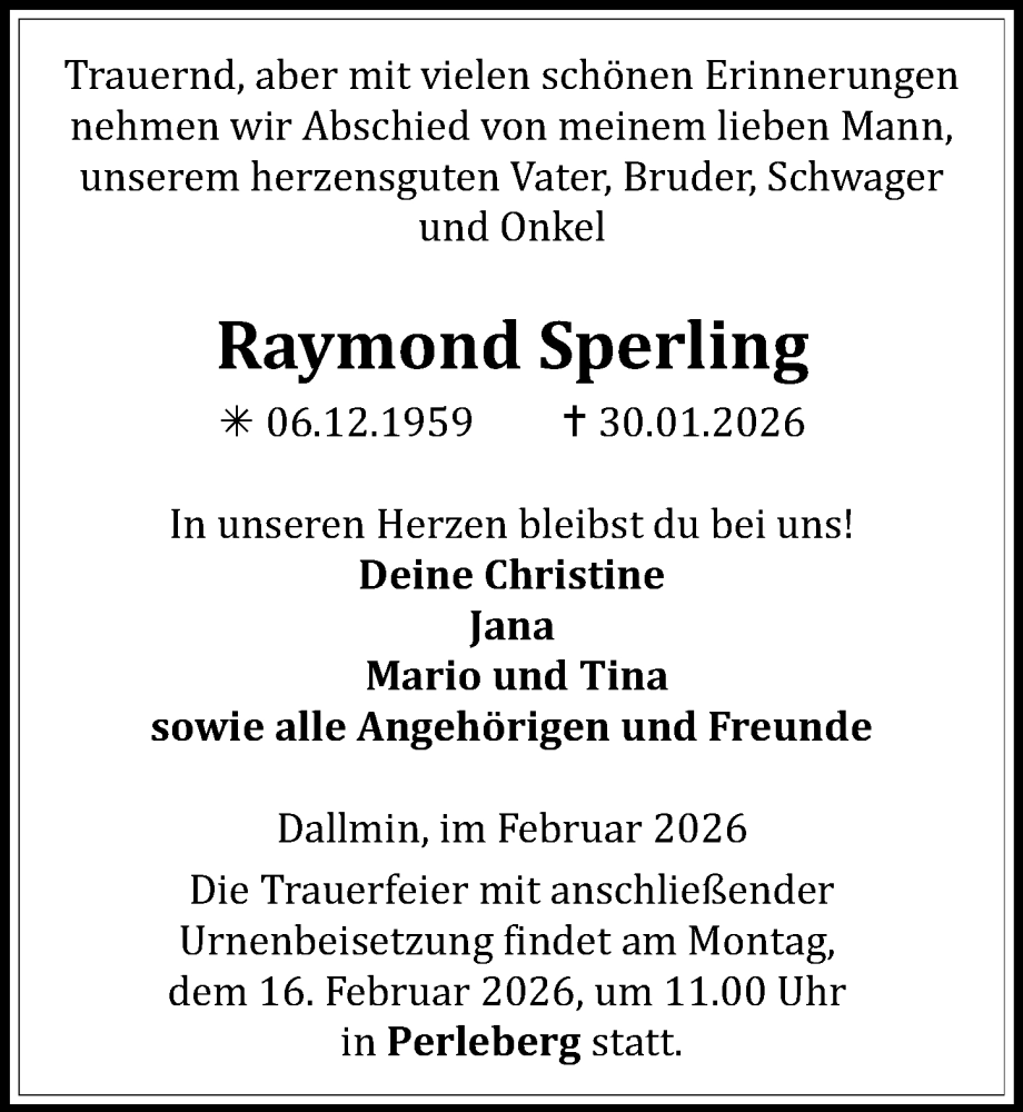 Hier finden Sie alle Traueranzeigen aus der Zeitung, die bisher für Raymond Sperling erschienen sind. Weitere Traueranzeigen, die in der Zeitung erscheinen, werden hier ebenfalls aufgelistet