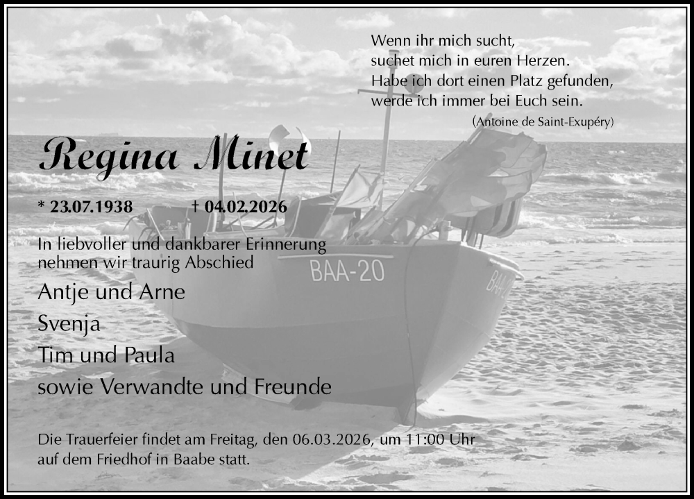 Hier finden Sie alle Traueranzeigen aus der Zeitung, die bisher für Regina Minet erschienen sind. Weitere Traueranzeigen, die in der Zeitung erscheinen, werden hier ebenfalls aufgelistet