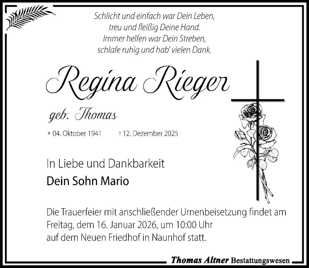 Hier finden Sie alle Traueranzeigen aus der Zeitung, die bisher für Regina Rieger erschienen sind. Weitere Traueranzeigen, die in der Zeitung erscheinen, werden hier ebenfalls aufgelistet