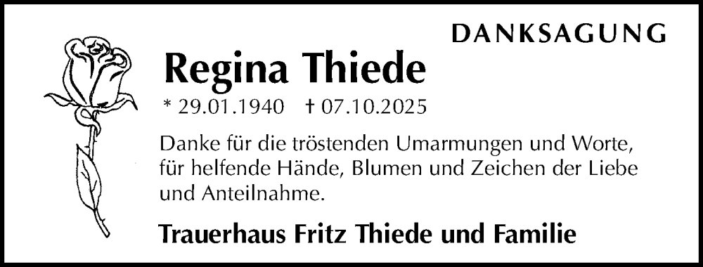 Hier finden Sie alle Traueranzeigen aus der Zeitung, die bisher für Regina Thiede erschienen sind. Weitere Traueranzeigen, die in der Zeitung erscheinen, werden hier ebenfalls aufgelistet