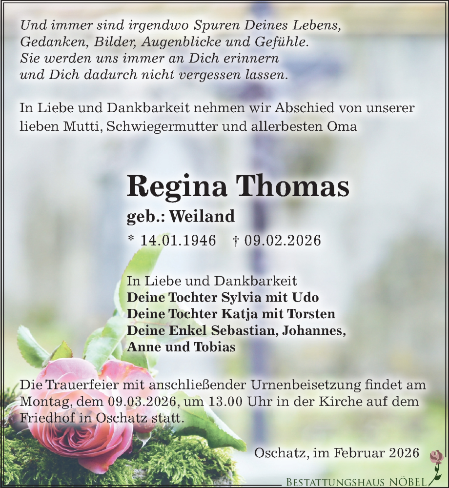Hier finden Sie alle Traueranzeigen aus der Zeitung, die bisher für Regina Thomas erschienen sind. Weitere Traueranzeigen, die in der Zeitung erscheinen, werden hier ebenfalls aufgelistet