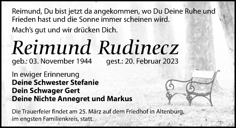 Hier finden Sie alle Traueranzeigen aus der Zeitung, die bisher für Reimund Rudinecz erschienen sind. Weitere Traueranzeigen, die in der Zeitung erscheinen, werden hier ebenfalls aufgelistet