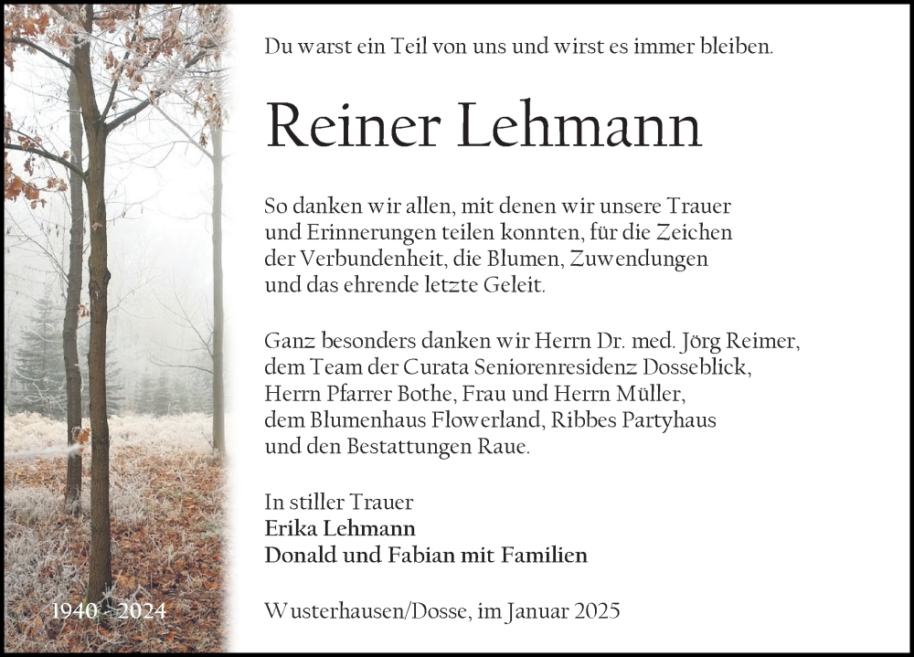 Hier finden Sie alle Traueranzeigen aus der Zeitung, die bisher für Reiner Lehmann erschienen sind. Weitere Traueranzeigen, die in der Zeitung erscheinen, werden hier ebenfalls aufgelistet