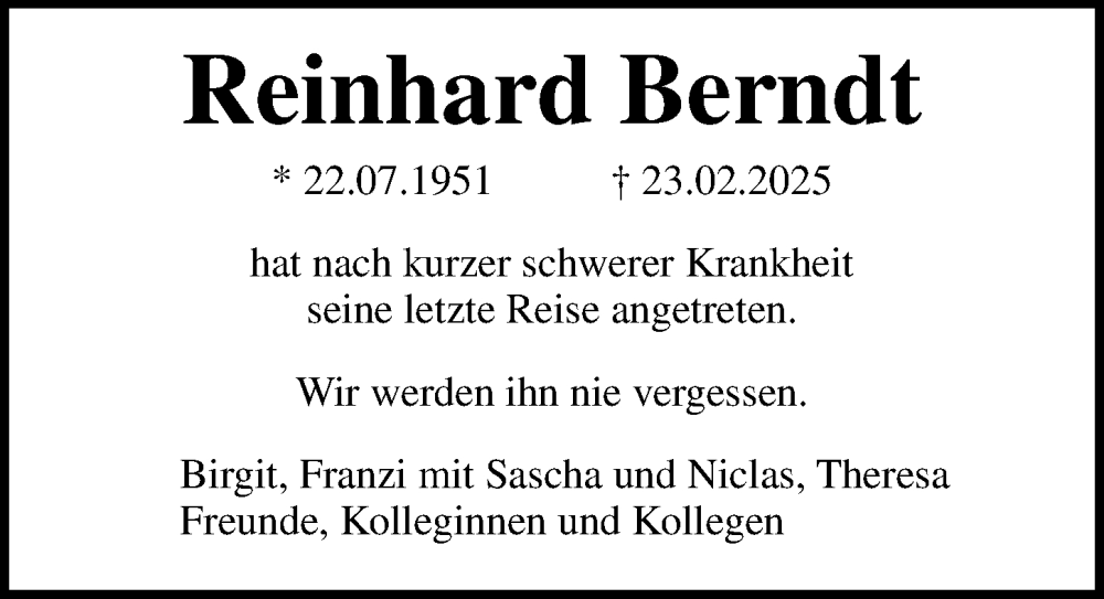 Hier finden Sie alle Traueranzeigen aus der Zeitung, die bisher für Reinhard Berndt erschienen sind. Weitere Traueranzeigen, die in der Zeitung erscheinen, werden hier ebenfalls aufgelistet