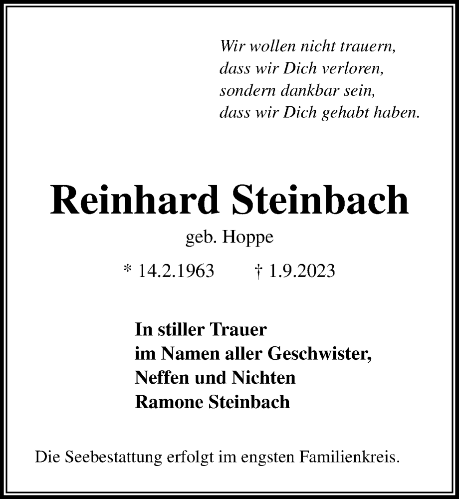 Hier finden Sie alle Traueranzeigen aus der Zeitung, die bisher für Reinhard Steinbach erschienen sind. Weitere Traueranzeigen, die in der Zeitung erscheinen, werden hier ebenfalls aufgelistet
