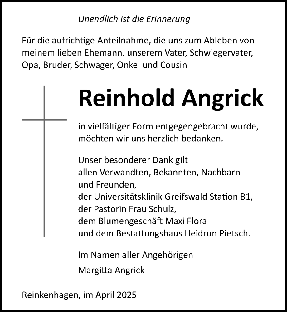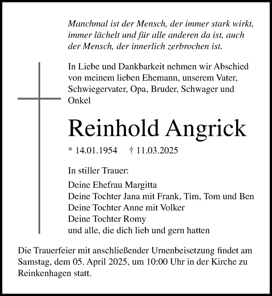 Hier finden Sie alle Traueranzeigen aus der Zeitung, die bisher für Reinhold Angrick erschienen sind. Weitere Traueranzeigen, die in der Zeitung erscheinen, werden hier ebenfalls aufgelistet