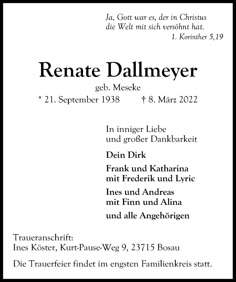 Hier finden Sie alle Traueranzeigen aus der Zeitung, die bisher für Renate Dallmeyer erschienen sind. Weitere Traueranzeigen, die in der Zeitung erscheinen, werden hier ebenfalls aufgelistet