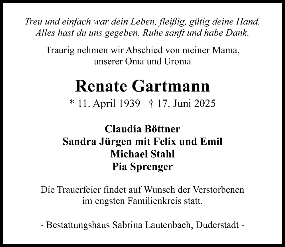 Hier finden Sie alle Traueranzeigen aus der Zeitung, die bisher für Renate Gartmann erschienen sind. Weitere Traueranzeigen, die in der Zeitung erscheinen, werden hier ebenfalls aufgelistet