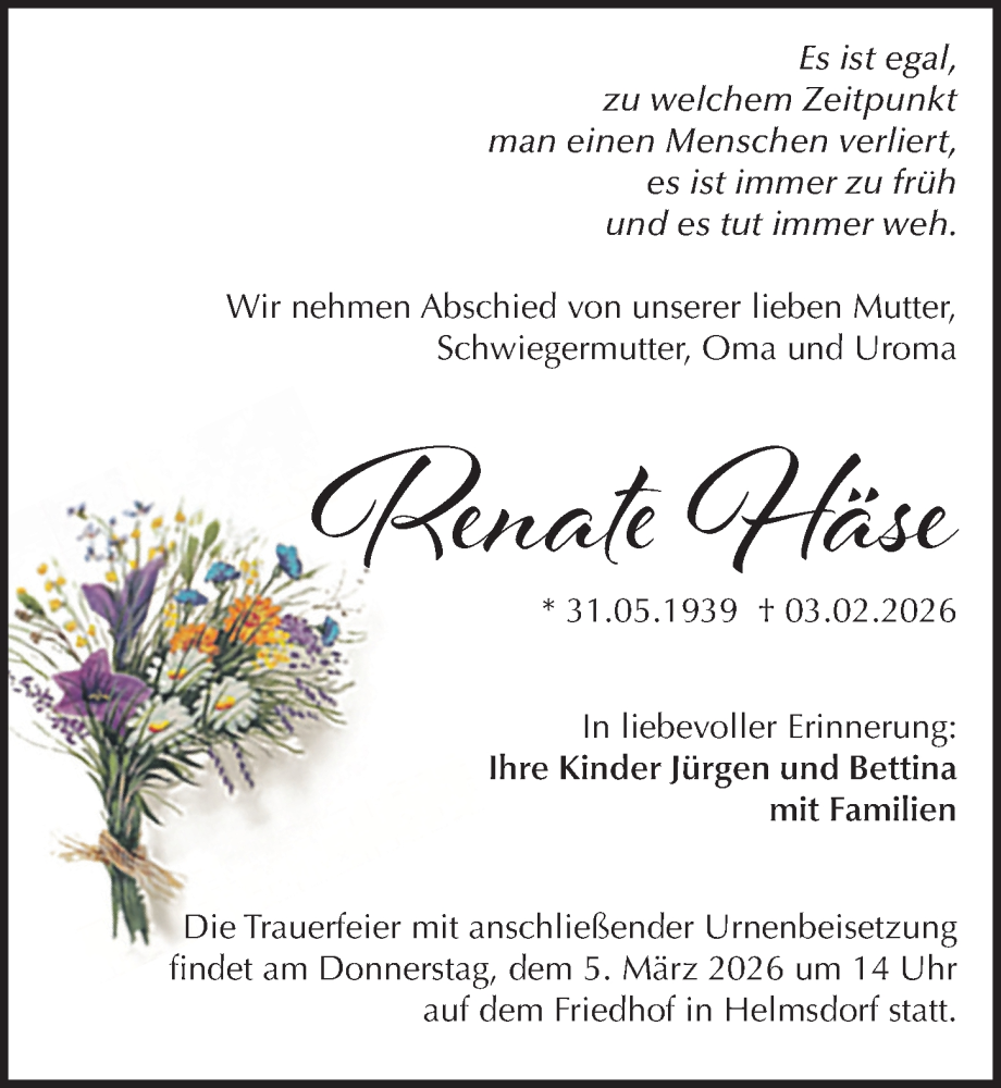 Hier finden Sie alle Traueranzeigen aus der Zeitung, die bisher für Renate Häse erschienen sind. Weitere Traueranzeigen, die in der Zeitung erscheinen, werden hier ebenfalls aufgelistet