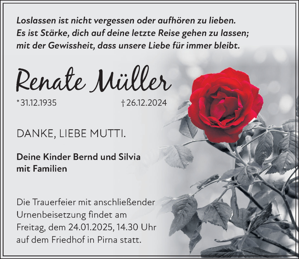 Hier finden Sie alle Traueranzeigen aus der Zeitung, die bisher für Renate Müller erschienen sind. Weitere Traueranzeigen, die in der Zeitung erscheinen, werden hier ebenfalls aufgelistet