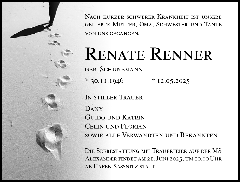Hier finden Sie alle Traueranzeigen aus der Zeitung, die bisher für Renate Renner erschienen sind. Weitere Traueranzeigen, die in der Zeitung erscheinen, werden hier ebenfalls aufgelistet