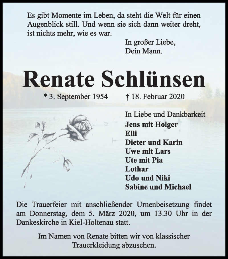 Hier finden Sie alle Traueranzeigen aus der Zeitung, die bisher für Renate Schlünsen erschienen sind. Weitere Traueranzeigen, die in der Zeitung erscheinen, werden hier ebenfalls aufgelistet