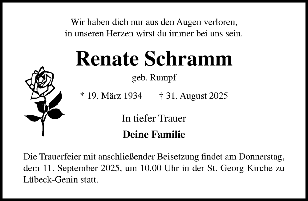 Hier finden Sie alle Traueranzeigen aus der Zeitung, die bisher für Renate Schramm erschienen sind. Weitere Traueranzeigen, die in der Zeitung erscheinen, werden hier ebenfalls aufgelistet