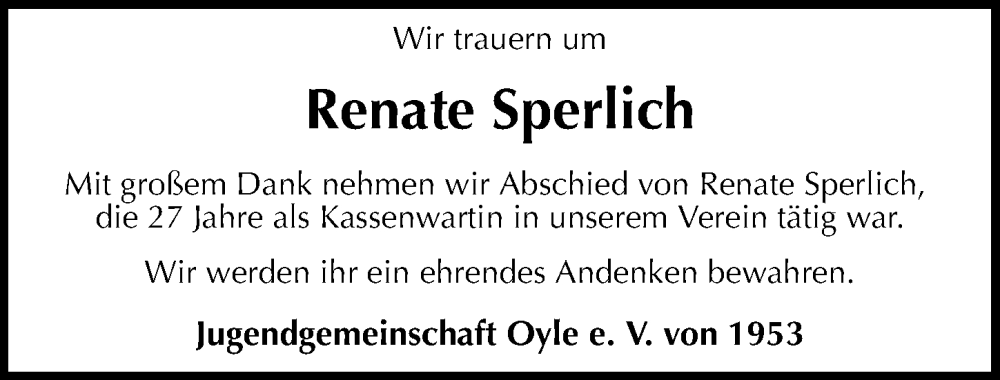 Hier finden Sie alle Traueranzeigen aus der Zeitung, die bisher für Renate Sperlich erschienen sind. Weitere Traueranzeigen, die in der Zeitung erscheinen, werden hier ebenfalls aufgelistet