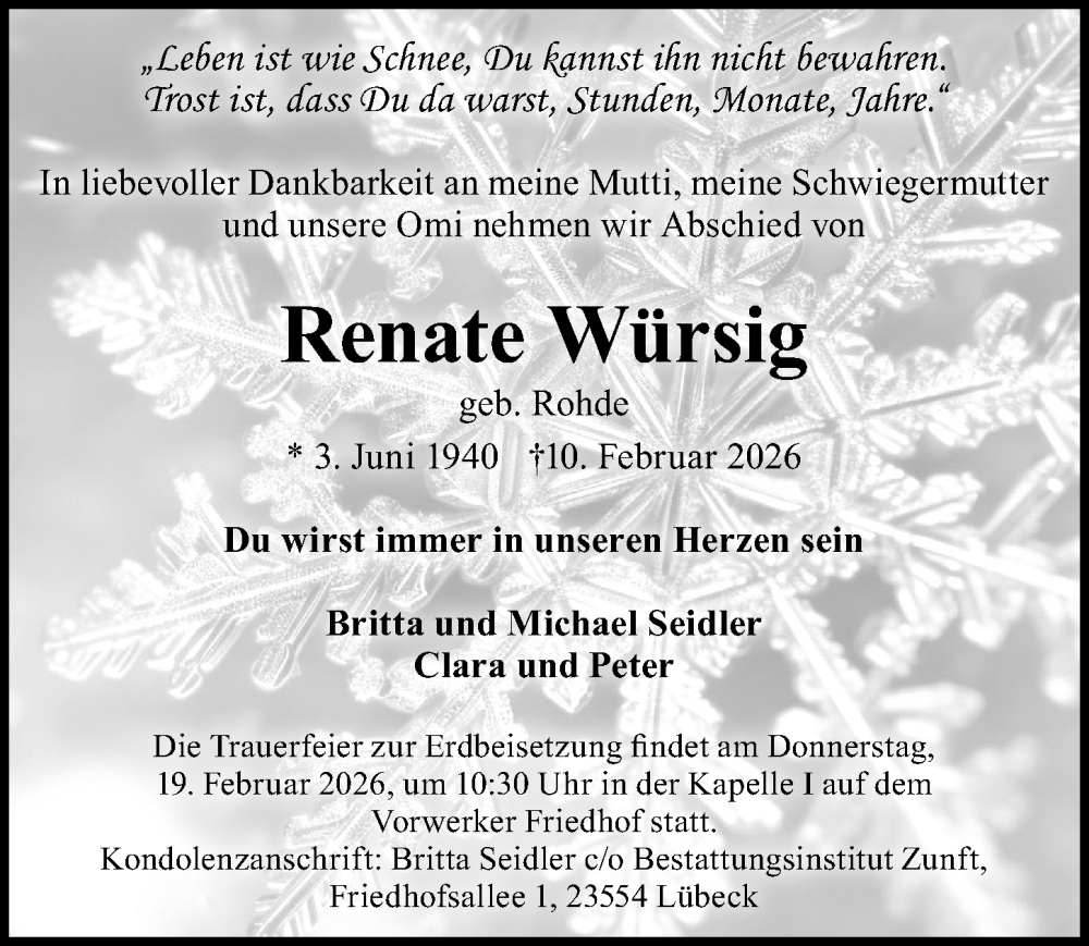 Hier finden Sie alle Traueranzeigen aus der Zeitung, die bisher für Renate Würsig erschienen sind. Weitere Traueranzeigen, die in der Zeitung erscheinen, werden hier ebenfalls aufgelistet