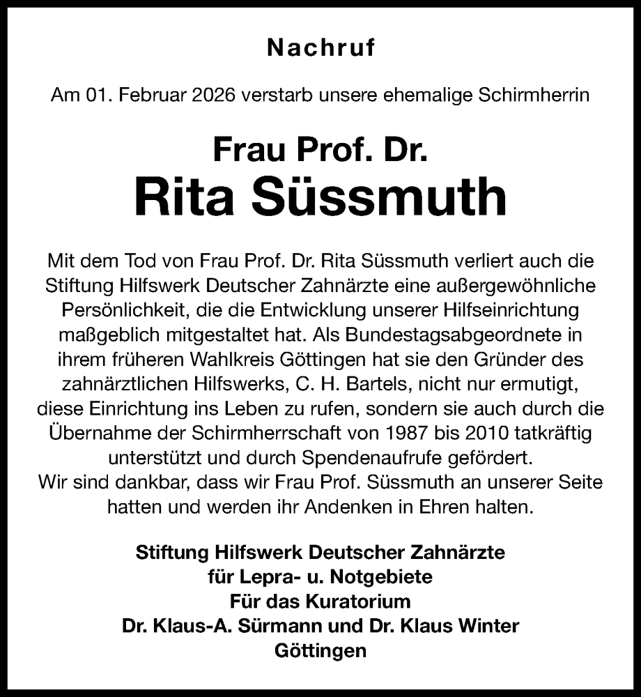 Hier finden Sie alle Traueranzeigen aus der Zeitung, die bisher für Rita Süssmuth erschienen sind. Weitere Traueranzeigen, die in der Zeitung erscheinen, werden hier ebenfalls aufgelistet