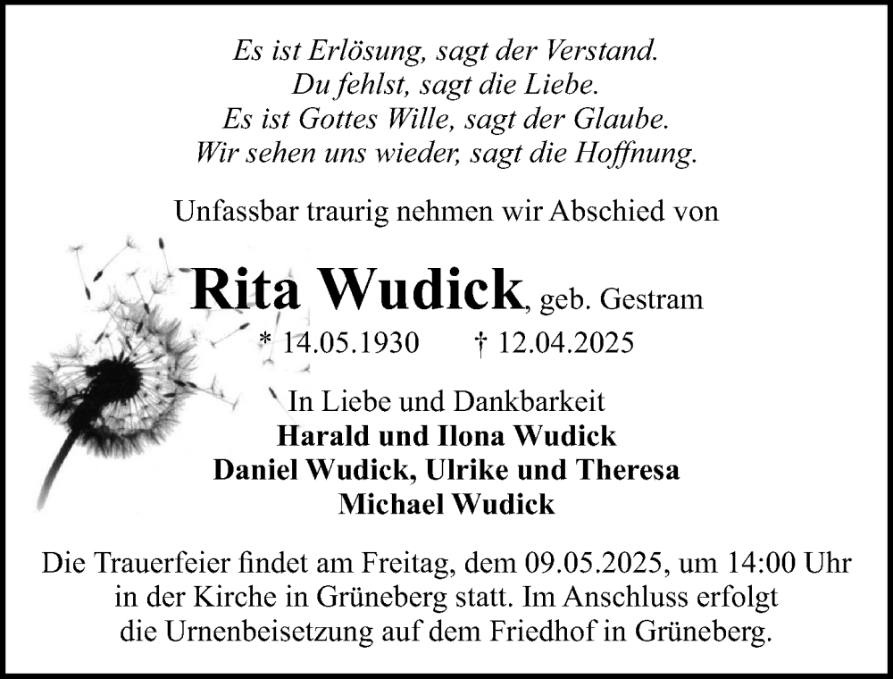 Hier finden Sie alle Traueranzeigen aus der Zeitung, die bisher für Rita Wudick erschienen sind. Weitere Traueranzeigen, die in der Zeitung erscheinen, werden hier ebenfalls aufgelistet