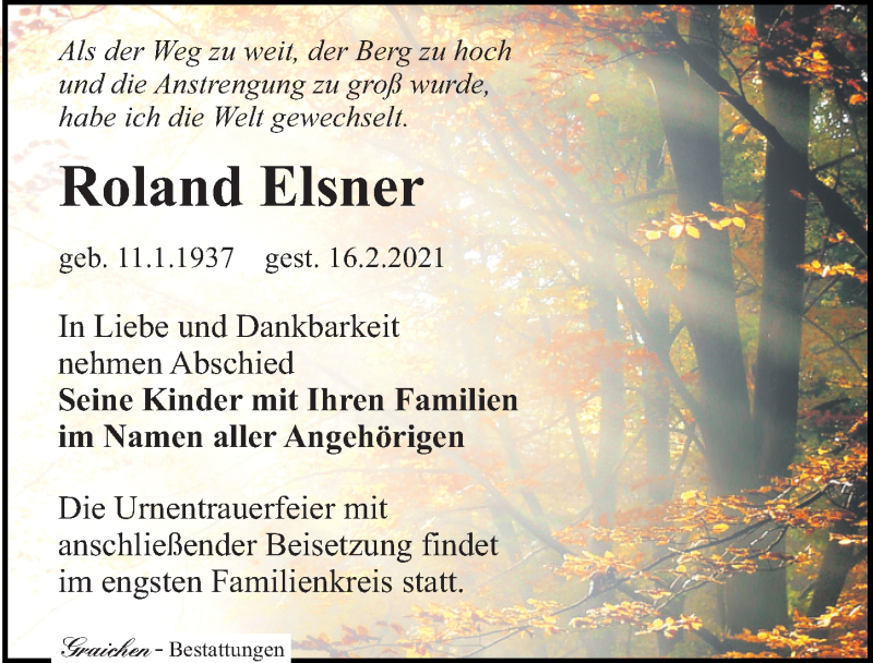 Hier finden Sie alle Traueranzeigen aus der Zeitung, die bisher für Roland Elsner erschienen sind. Weitere Traueranzeigen, die in der Zeitung erscheinen, werden hier ebenfalls aufgelistet