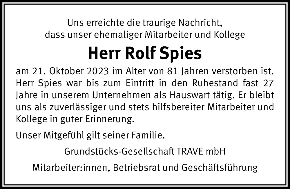 Hier finden Sie alle Traueranzeigen aus der Zeitung, die bisher für Rolf Spies erschienen sind. Weitere Traueranzeigen, die in der Zeitung erscheinen, werden hier ebenfalls aufgelistet