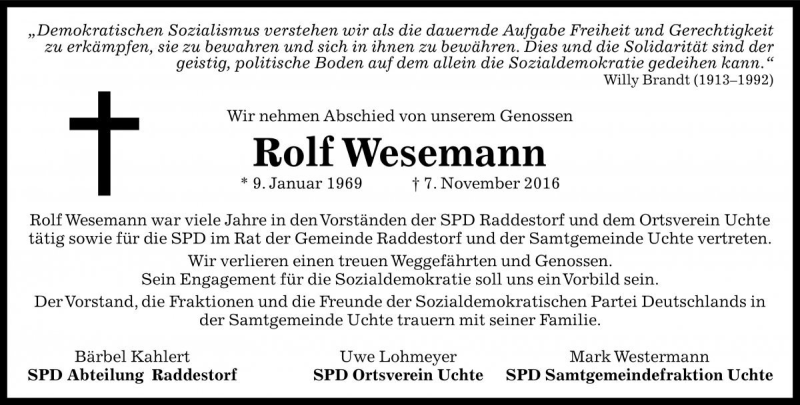 Hier finden Sie alle Traueranzeigen aus der Zeitung, die bisher für Rolf Wesemann erschienen sind. Weitere Traueranzeigen, die in der Zeitung erscheinen, werden hier ebenfalls aufgelistet