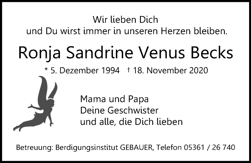 Hier finden Sie alle Traueranzeigen aus der Zeitung, die bisher für Ronja Sandrine Venus Becks erschienen sind. Weitere Traueranzeigen, die in der Zeitung erscheinen, werden hier ebenfalls aufgelistet
