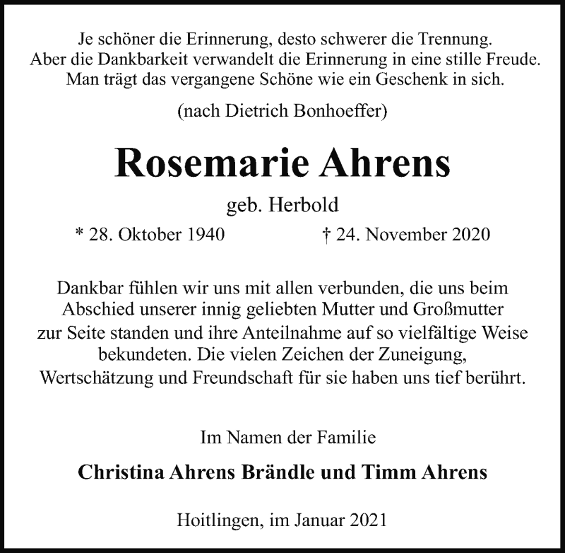 Hier finden Sie alle Traueranzeigen aus der Zeitung, die bisher für Rosemarie Ahrens erschienen sind. Weitere Traueranzeigen, die in der Zeitung erscheinen, werden hier ebenfalls aufgelistet